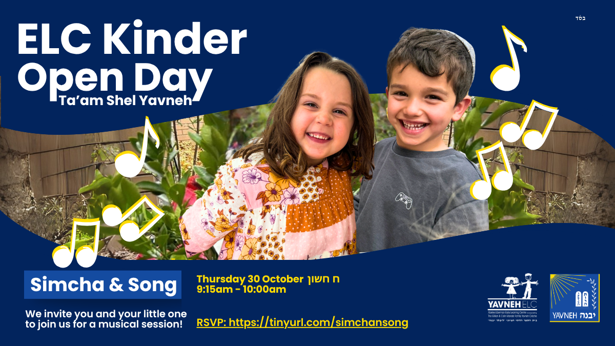 We are excited to invite your child(ren) to our various Taam Shel Yavneh experiences at the Leibler Yavneh College ELC in 2025. For Parents it is a fantastic opportunity to meet our Kinder staff, view our facilities and mingle with others looking to join the Yavneh family in 2026. If you are able to attend our Simcha & Song Group Session on Thursday 30 October, we kindly ask that you RSVP via this quick and easy form below. We look forward to seeing you and your little one there! Any questions at all please email the enrolments team at enrolments@yavneh.vic.edu.au